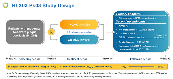 HLX03-Ps03是一項多中心、隨機、雙盲、平行對照的3期臨床試驗(臨床試驗號:NCT03316781),旨在比較HLX03與原研阿達木單抗在中國中重度斑塊狀銀屑病患者中的療效、安全性和免疫原性差異。納入的患者按照1:1的比例隨機分為兩組,通過皮下注射HLX03或原研阿達木單抗進行給葯。第1周第1天藥物初始劑量為80 mg,第2周第1天藥物劑量調整為40 mg,此後直至第48周,藥物劑量為每2周一次,每次40 mg。本試驗的主要研究終點為第16周時銀屑病面積與嚴重程度指數(PASIwk16)相對於基線改善的百分比。