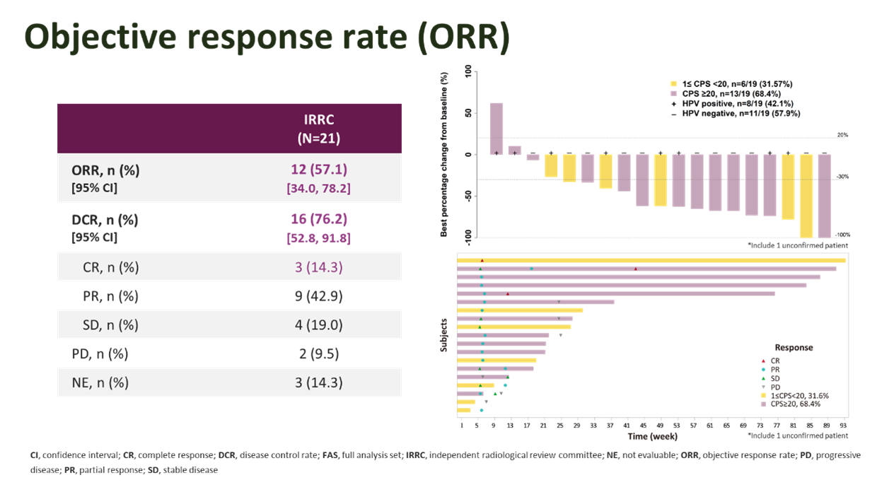 截止到2021年12月31日,本試驗共入組21名患者,其平均綜合陽性分數(CPS)為39.3,中位隨訪時間為14.6個月(範圍:0.2–21.7)。經IRRC評估的ORR為57.1%(95% CI:34.0,78.2;3例完全緩解,9例部分緩解)。中位持續緩解時間(DoR)尚未達到。IRRC評估的中位無進展生存期(PFS)為5.7個月(95% CI:3.0,NA),12個月PFS率為48.2%(95% CI:23.3,69.5)。中位總生存期(OS)為15.5個月(95% CI:10.5,NA),12個月OS率為71.1%(95% CI:46.6,85.9)。17名患者發生3級及以上的治療期間出現的不良事件(TEAEs),最常見的是中性粒細胞計數降低(n=7,33.3%)和白細胞計數降低(n=6,28.6%)和貧血(n=5,23.8%)。研究期間未出現導致斯魯利單抗停藥的TEAEs。