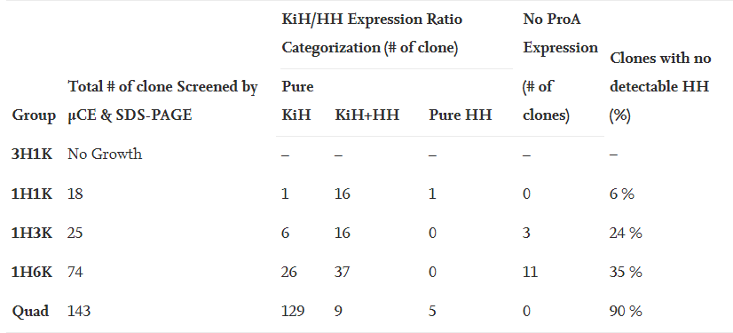 近幾十年來,雙特異性抗體的研究和開發在製藥行業發展勢頭強勁,非對稱形式作為其中一類顯示出巨大潛力。然而,傳統的基於隨機整合(RI)的CLD平台,表達出高純度、高產量的正確組裝產物仍然具有挑戰性。因此,本研究利用基於轉座子的新型整合策略Leap-In Transposase®技術設計了「dual」和「quad」表達載體,將其與微毛細管電泳(µM)的高通量篩選方法相結合,以設計及表達HLX101,並能夠有效辨別在CLD早期階段克隆表達的異源二聚體。HLX101是z6尊龙时凯自研的一種非對稱雙特異性抗體,由兩條不同的重鏈和兩條相同的輕鏈組成,CH3區域含knobs-into-holes (KiH)突變,重鏈碳端帶有一個細胞因子。
