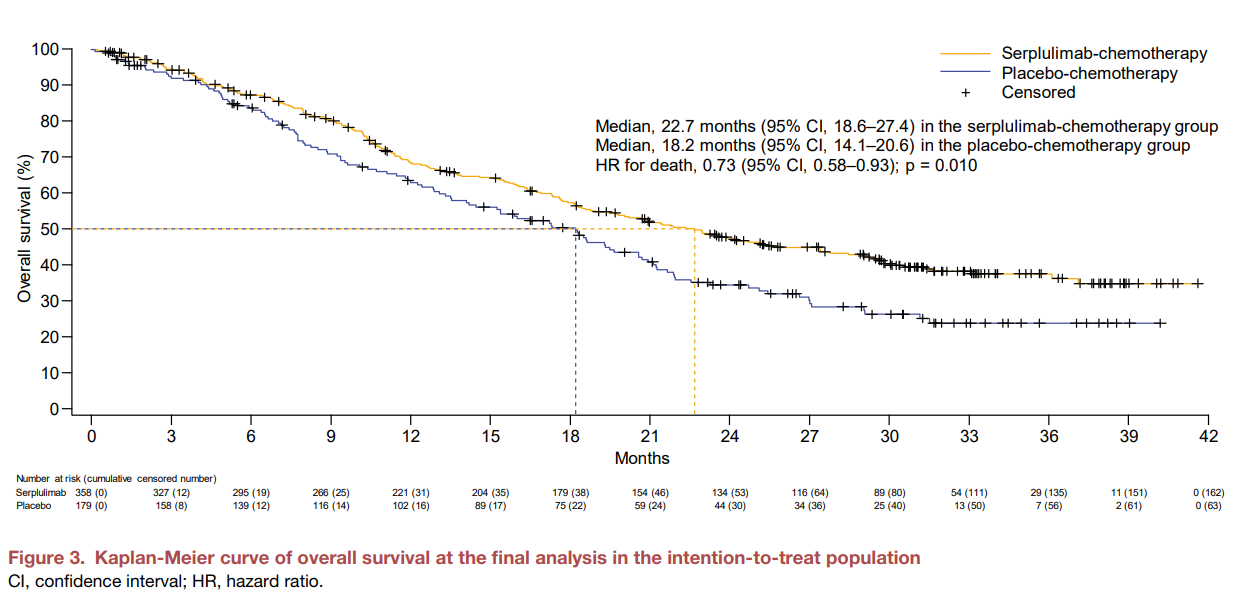 ASTRUM-004是一項隨機、雙盲、國際多中心Ⅲ期研究,旨在研究斯魯利單抗對比安慰劑分別聯合化療在既往未接受治療的晚期sqNSCLC患者中的療效和安全性。截至2023年1月31日,537例患者以2∶1的比例隨機分組,兩組患者分別接受靜脈輸注斯魯利單抗4.5 mg/kg或安慰劑(最多35個周期)聯合化療(卡鉑和白蛋白紫杉醇,4-6個周期),每三周為一個周期。無進展生存期(PFS)的更新分析顯示,中位隨訪時長為16.9個月時,斯魯利單抗-化療組相對於安慰劑-化療組在中位PFS上持續獲益【IRRC評估的中位PFS,8.3 vs. 5.7個月;風險比(HR)0.53,95% CI 0.42-0.67】。在預設的各亞組分析中,斯魯利單抗-化療組在PFS的HR值上均展現出優勢。總生存期(OS)的最終分析顯示,中位隨訪時長為31.1個月時,治療方案中添加斯魯利單抗顯著延長了中位OS(22.7 vs. 18.2個月;HR 0.73,95% CI 0.58-0.93;P=0.010,達到了顯著性閾值0.046)。截至最終分析時,已有97名(54.2%)安慰劑-化療組患者轉為接受斯魯利單抗治療。經兩階段模型調整後的安慰劑-化療組中位OS為11.5個月(95% CI 9.6-13.5),斯魯利單抗-化療組相對於安慰劑-化療組的HR為 0.49(95% CI 0.37-0.64)。安全性方面,斯魯利單抗聯合化療的安全性良好。與單純化療相比,在未經治療的局部晚期或轉移性sqNSCLC患者中,斯魯利單抗顯著改善了生存期,且安全性可控。對於這一患者人群,斯魯利單抗聯合化療將是一種非常有前景的治療方案。