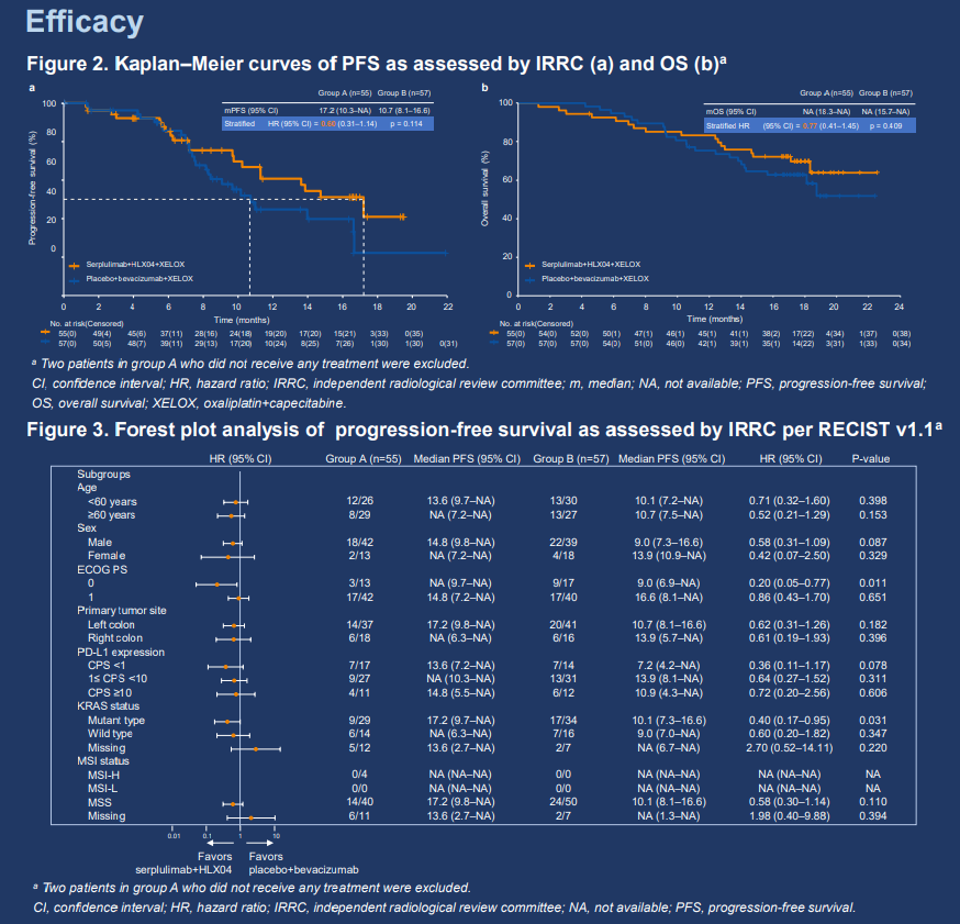 這是一項隨機、雙盲、多中心的II/III期研究;此次將側重於介紹II期部分。既往未接受過系統性治療的不可切除轉移性/復發性結直腸腺癌患者按1:1的比例隨機分組,分別接受斯魯利單抗(300 mg,Q3W IV)聯合HLX04(貝伐珠單抗,7.5 mg/kg,Q3W IV)和XELOX(A組)或安慰劑聯合貝伐珠單抗和XELOX(B組)治療。隨機化按PD-L1表達水平(CPS <1 vs. 1≤ CPS <50 vs. CPS ≥50)、ECOG PS評分(0 vs. 1)和原發腫瘤部位(左側 vs. 右側)進行分層。主要終點是IRRC根據RECIST 1.1評估的PFS。次要終點包括其他療效終點、安全性、藥代動力學、生物標誌物探索和生活質量評估。
