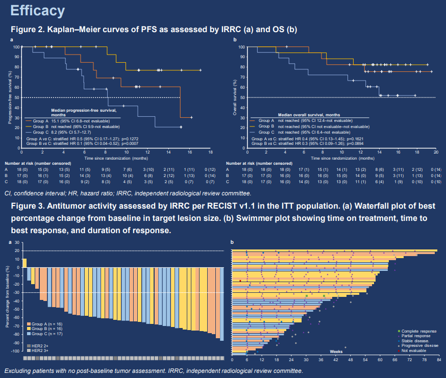 本研究在最後一例患者入組3個月後揭盲。入組的患者為既往未接受過系統性抗腫瘤治療的局部晚期或轉移性HER2陽性胃/胃食管交界部(G/GEJ)癌患者。研究分為兩個部分,本報告將側重於介紹第一部分。在第一部分中,患者按1:1:1的比例隨機分組,分別接受HLX22(創新型抗HER2單抗)25 mg/kg + HLX02(曲妥珠單抗)+ XELOX(A組)、HLX22 15 mg/kg + HLX02 + XELOX(B組)或安慰劑 + HLX02 + XELOX(C組)治療,每3周為一個周期。主要終點是由IRRC根據RECIST v1.1評估的PFS和ORR。次要終點包括其他療效指標和安全性。