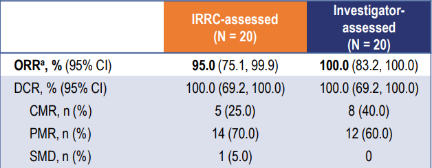 截至2023年7月14日,共有30例患者入组。患者的中位年龄为38.5岁;13(43.3%)例患者为男性。19(63.3%)例患者被诊断为LCH,10(33.3%)例被诊断为ECD,1(3.3%)例为LCH合并ECD。8(26.7%)例患者为单系统多病灶病变,22(73.3%)例为多系统病变。中位随访时间为10.7个月。在20例疗效可评估的患者中,IRRC根据PERCIST 1.0评估的未确认的ORR为95.0%(95% CI 75.1–99.9%)。肿瘤缓解的详细结果见表1。在接受HLX208治疗的30例患者中,有5(16.7%)例报告了3–4级治疗相关不良事件,最常见的是丙氨酸氨基转移酶升高(6.7%)和天门冬氨酸氨基转移酶升高(6.7%)。治疗期间未见导致死亡的不良事件。