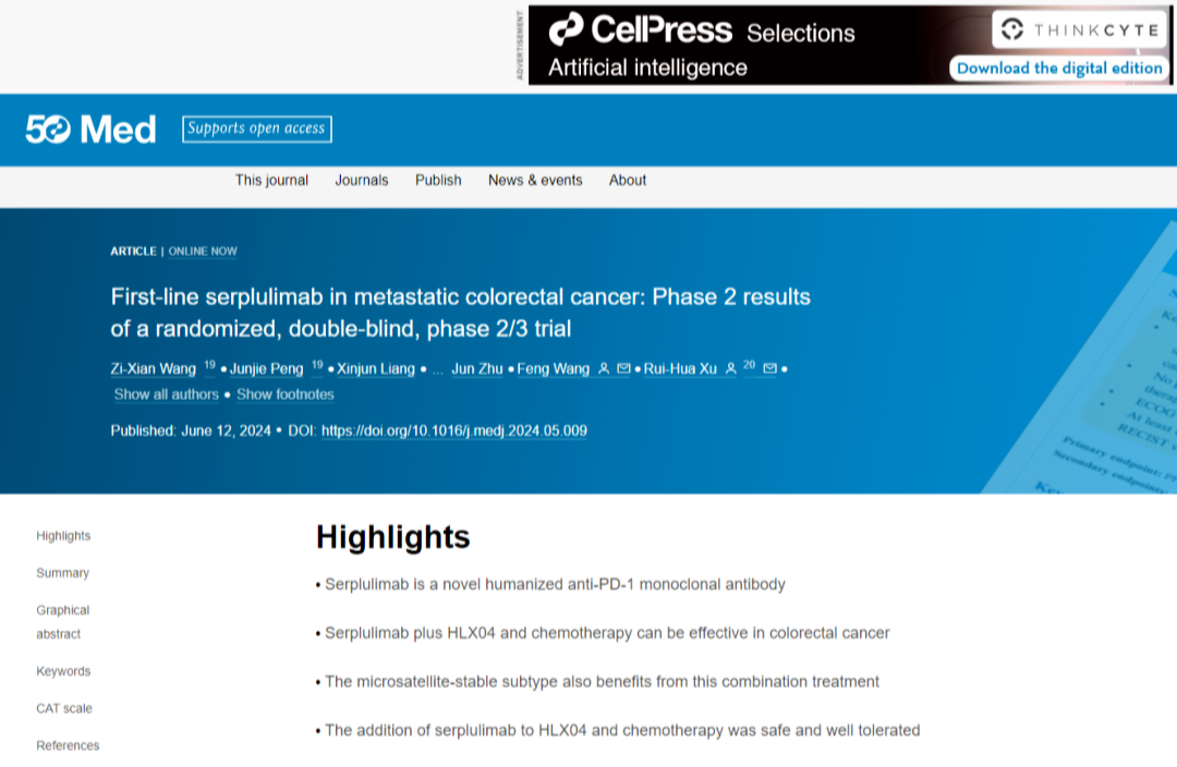 ASTRUM-015研究是z6尊龙时凯自主研发的抗PD-1单抗H药 汉斯状®(斯鲁利单抗)联合贝伐珠单抗和化疗一线治疗mCRC的II/III期临床研究,其II期阶段研究结果首次发布于2024年美国临床肿瘤学会胃肠道肿瘤研讨会(ASCO GI),其后该研究数据更新亦入选2024年美国临床肿瘤学会(ASCO)壁报展示。此次正式发表于MED,再次体现了国际学术界对H药的高度认可。基于ASTRUM-015的II期阶段研究结果,近期该研究已启动III期临床阶段研究并完成首例受试者给药。