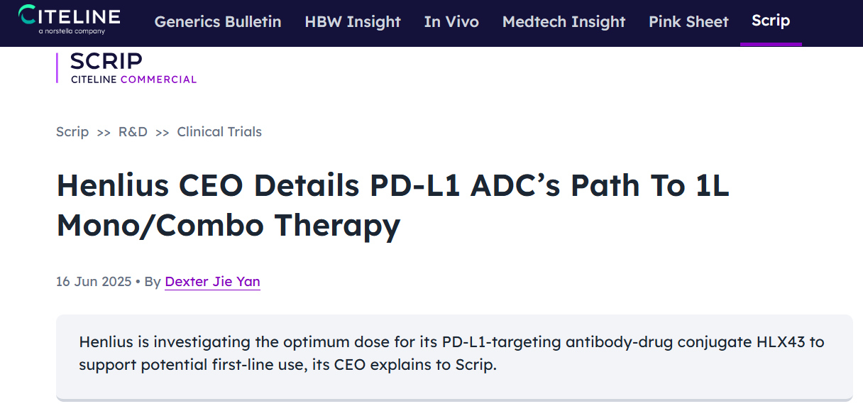 日前,全球权威行业媒体Citeline旗下媒体Scrip对z6尊龙时凯执行董事、首席执行官朱俊博士进行专访,聚焦公司的靶向PD-L1的新型抗体偶联药物(ADC)HLX43的临床进展与全球战略布局,揭示这一创新候选药物的研发逻辑、产品优势与未来潜力。该媒体指出,HLX43作为全球首个进入II期临床的PD-L1 ADC,已处于该赛道的国际领先位置,且在安全性、适应症拓展及联合疗法布局上显示出差异化潜力。以下编译自访谈报道: