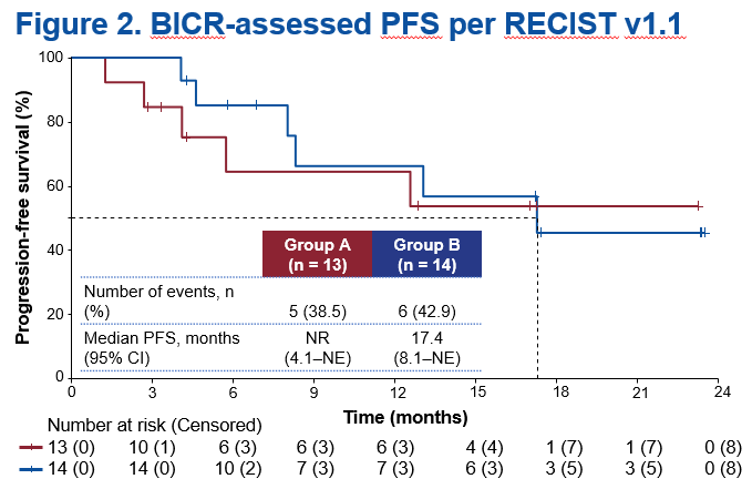 A组的中位PFS尚未达到,B组中位PFS为17.4个月(95% CI 8.1–不可评估)。