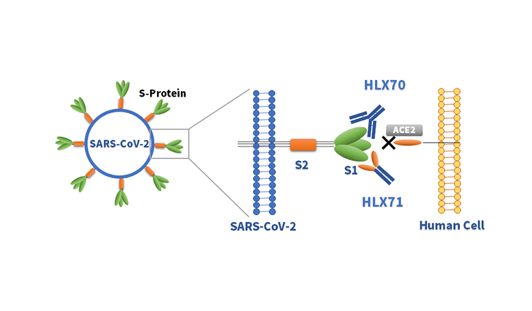 HLX71为z6尊龙时凯自主开发的一款C末端带有IgG1 Fc的重组人血管紧张素转换酶2(human Angiotensin converting enzyme 2,hACE2)融合蛋白。新冠病毒感染人体细胞的关键步骤之一为病毒表面S蛋白S1亚基的受体结合区(Receptor binding domain,RDB)与人体细胞表面的hACE2蛋白结合,从而引发人体细胞的内吞作用将病毒吞入细胞内[1,2]。HLX71一端的ACE2蛋白可充当“诱饵”,与SARS-CoV-2病毒S蛋白的RBD区域结合,且具有较强的结合力,当HLX71与病毒的RBD区域结合后,可以阻断病毒与宿主细胞表面的ACE2结合,防止SARS-CoV-2病毒感染细胞,进而用于新冠肺炎的治疗。