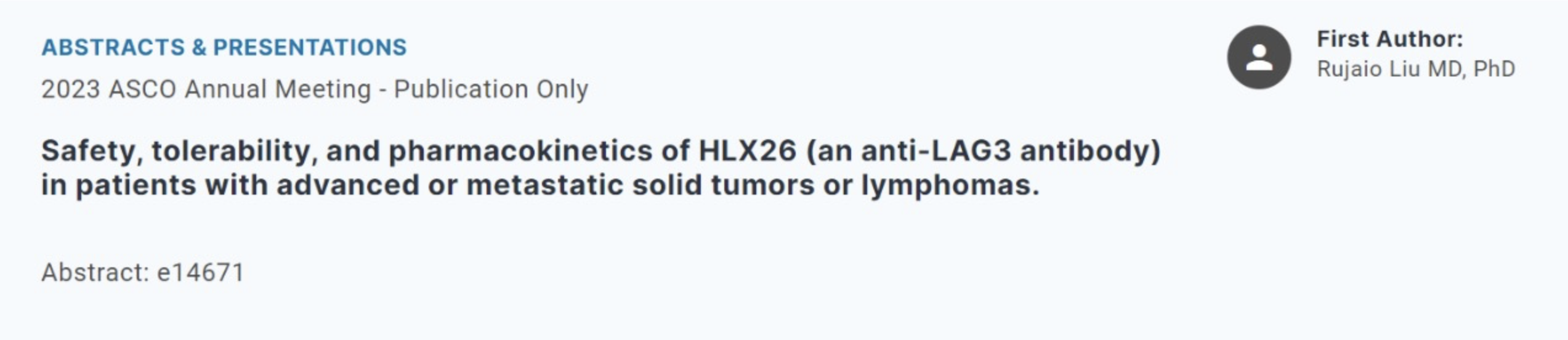 HLX26(抗LAG3抗体)在晚期或转移性实体瘤或淋巴瘤患者中的安全性、耐受性及药代动力学特征(摘要编号e14671)。