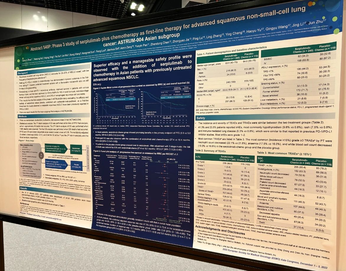近日,公司自主研发的H药汉斯状®(斯鲁利单抗)联合化疗用于一线治疗不可手术切除的局部晚期或转移性鳞状非小细胞肺癌(sqNSCLC)的注册性III期临床试验ASTRUM-004研究的亚洲人亚组数据入选2023欧洲肿瘤学会亚洲分会(ESMO Asia)年会,以壁报的形式进行现场展示。ASTRUM-004研究由上海市肺科医院周彩存教授牵头开展,其总人群最终分析结果于2023年世界肺癌大会(World Conference on Lung Cancer, WCLC)以口头报告形式首次发布,研究结果显示,H药显著改善未经治疗的局部晚期或转移性sqNSCLC患者的生存期,且安全性可控。基于ASTRUM-004研究结果,H药已于2022年正式获得中国药监局批准用于联合化疗一线治疗sqNSCLC。